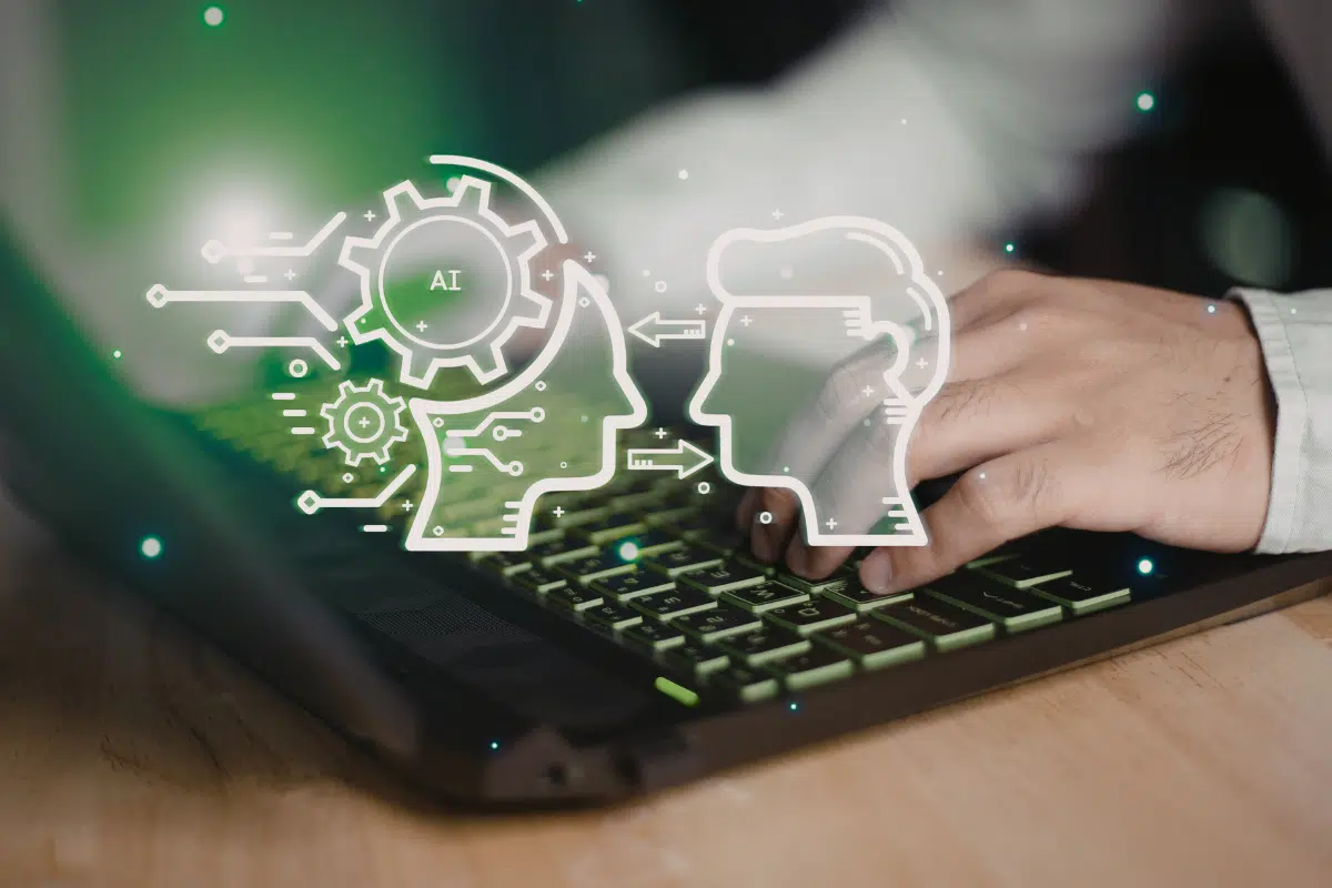 Hand bei der Nutzung des Laptops mit KI-Grafiken
